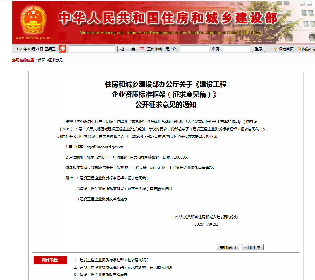 近日,住建部官網正式公布了關于《建設工程企業資質標準框架(征求意見稿)》公開征求意見的通知。